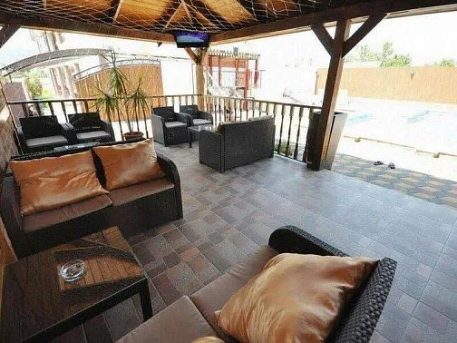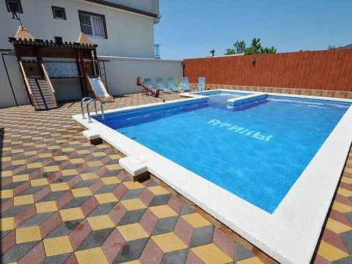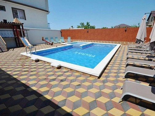 Благоустроенный, озеленённый и огороженный двор с детской площадкой. Здесь есть просторный стационарный подогреваемый бассейн с гейзерами, ночной подсветкой и отдельной зоной джакузи для детей. У бассейна оборудован бар для приятного отдыха на свежем воздухе, имеется зона для мангала.
