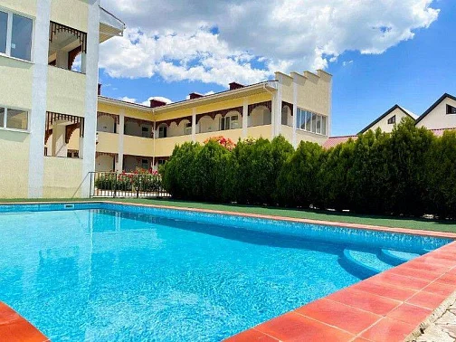 Собственное кафе с верандой и чистый бассейн на территории! Индивидуальный трансфер из/в аэропорт/вокзал на комфортабельном 7-местном минивэне Hyundai. Зона у бассейна оборудована шезлонгами; для детей есть батут и качели. На территории к вашим услугам сауна с кедровой бочкой.