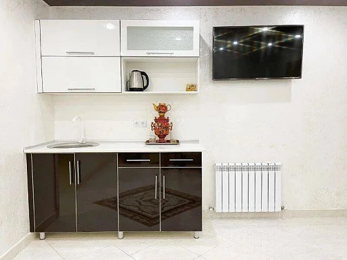 Кухня в номерах не предусмотрена. Готовить в номерах запрещено в целях пожарной безопасности. На веранде есть электрочайник для общего пользования. Бочка с питьевой водой на территории.