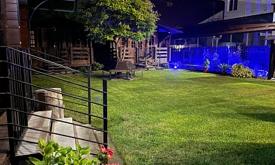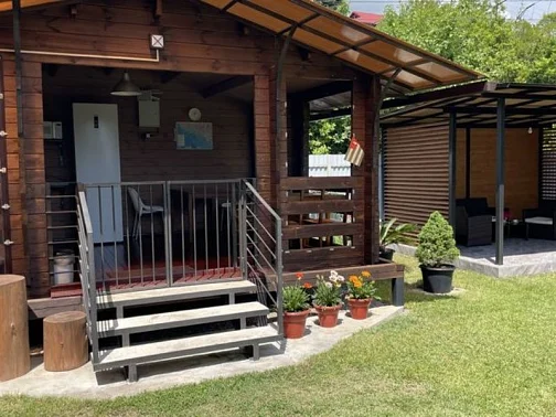 На 1 этаже: столовая-гостиная, внутренняя лестница, которая ведёт на 2 этаж, где находится одна спальная комната с санузлом и балконом! Также в доме есть терраса, которая находится на крыше дома, на которую поднимаешься по отдельной уличной лестнице, где могут отдыхать только посетители этого дома. Дом имеет всё своё: кухня, стиральная машина, утюг, фен.