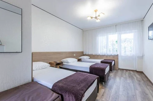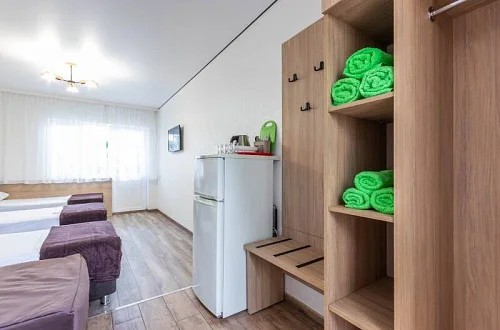 Для отдыха большой семьей предлагаем специальные семейные комнаты, где легко разместятся до 5 человек. Все комнаты оборудованы уголком с холодильником, чайником, набором посуды.