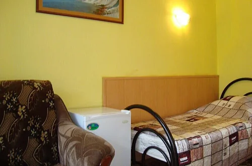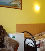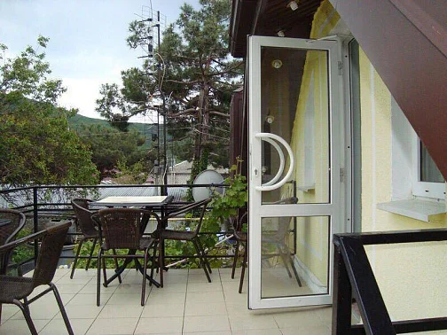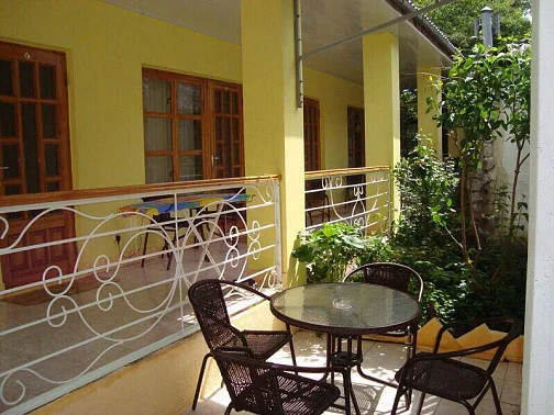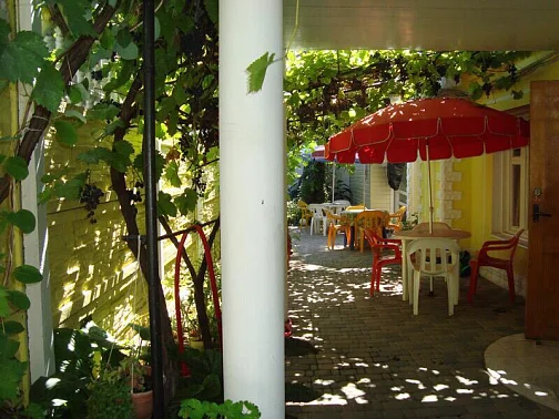 Гостевой дом "Бриз" расположен в центре курортного поселка, в спальном районе на расстоянии 800-900 м. от моря (10-15 мин. прогулочным шагом). Уютный двор утопает в зелени и цветах. Виноградная беседка создает благодатную тень, в которой можно найти спасение в жаркие, солнечные, летние деньки. Во дворе есть зона отдыха с бассейном, которая включает в себя сам бассейн с подогревом, площадью 26 кв.м. (3,5х7,5 м) и площадку с шезлонгами для загара. Двор вымощен брусчаткой. Во дворе установлены столы с зонтиками и креслами, за которыми можно отдыхать теплыми летними вечерами. Есть мангал, где можно приготовить блюда на углях. Небольшое количество людей в гостевом доме не создает эффекта "муравейника". Нет очередей. Вода холодная и горячая круглосуточно. Ночью работает подсветка гостевого дома, бассейна и двора, что создает дополнительно уют и комфорт. В каждом номере 20 каналов цифрового телевидения, а также бесплатный доступ к Wi-Fi.