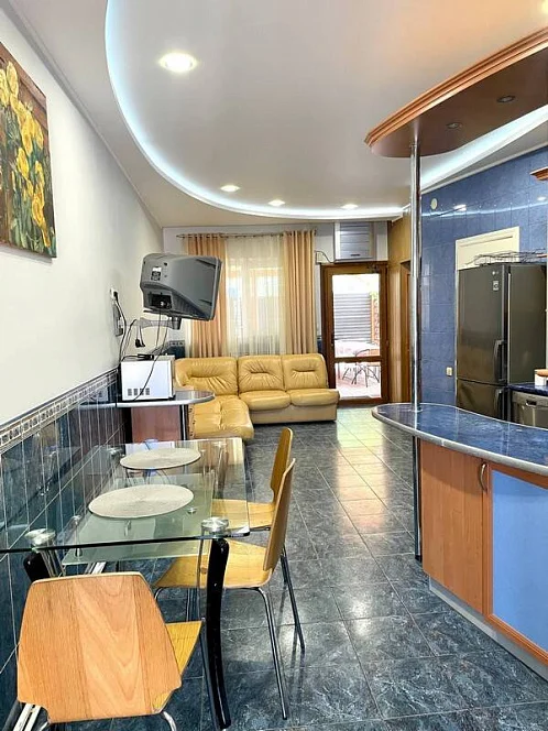 Дом с хорошим ремонтом, оснащен кондиционерами, телевизором с плоским экраном и спутниковыми каналами, прекрасно оборудован, современная мебель, удобная современная, ортопедические матрасы. Планировка дома - 3 комнаты (располагаются на 2 этаже), 2 спальные комнаты и гостиная с большим двухспальным диваном - позволяет комфортное размещение семьи из 7 человек. Предоставляются постельные принадлежности, комплекты полотенец. Просторная кухня расположена на 1 этаже, имеется холодильник, микроволновая печь, стиральная машинка, телевизор, предоставляется вся кухонная и столовая посуда.