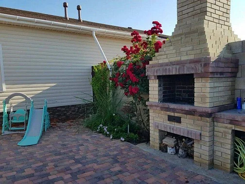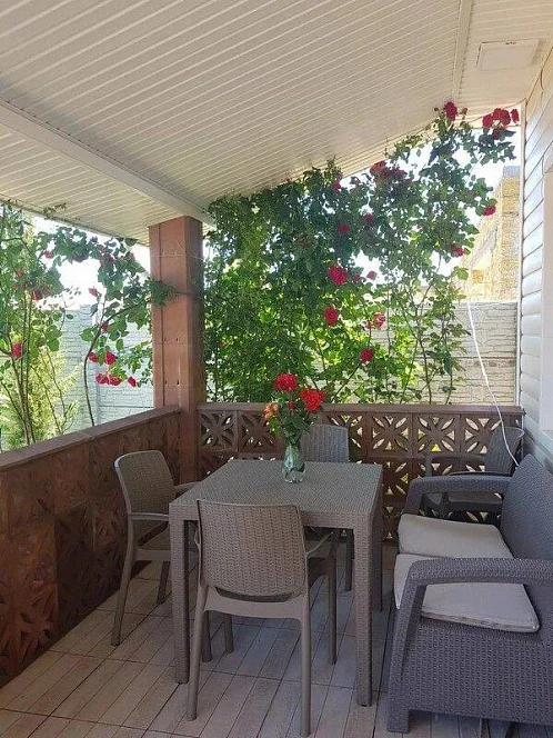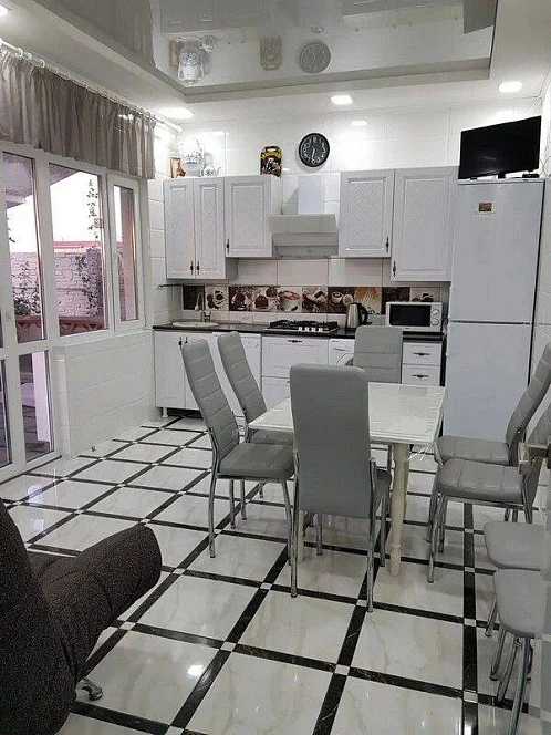 Есть двухспальный диван в столовой. Вся необходимая мебель, современный ремонт, кондиционер в каждой комнате, телевизор, интернет, Wi-Fi по всей территории, два санузла, стиральная машина-автомат, посудомоечная машина, выход из кухни на террасу (что очень удобно), огороженный двор, мангал, постельное бельё, полотенца, посуда, автоматические ворота.
