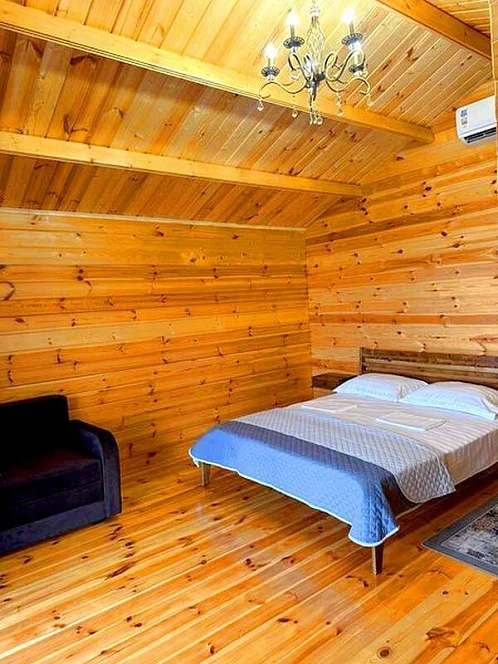 Каждый коттедж оснащен душевой комнатой с современной тропической душевой системой и встроенным феном. В просторной комнате двуспальная кровать с ортопедическим матрасом, диван, который трансформируется в доп. спальное место, шкаф, телевизор с Smart системой, холодильник.