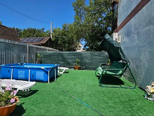 Есть стиральная машина, микроволновка, посуда, холодильник, 2 сплита и 2 телевизора .Во дворе мангал, стол, каркасный бассейн. Wi-Fi и вода горячая/холодная без перебоев.