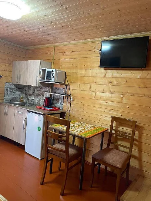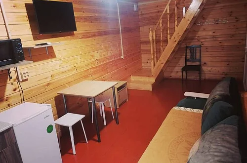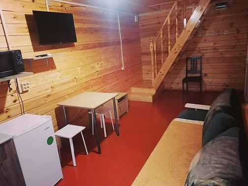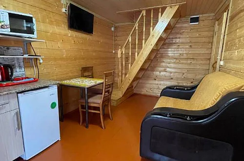 1 этаж: мини-кухня (посуда, эл. чайник, микроволновая печь, холодильник), обеденный стол, стулья, диван-кровать (1300х1950), телевизор ЖК. Санузел: душевая со шторой, унитаз, раковина с зеркалом, тазик, коврик. Спальня: диван-кровать (1400х1900), тумба прикроватная, тюль, портьера. Деревянная лестница для подъема на 2 этаж, сплит-система.
