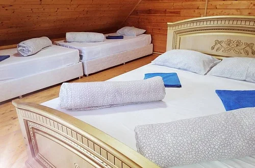 2этаж: мансарда: 3 односпальные кровати (800х1950), матрац пружинный или двуспальная кровать (1400х2000) и односпальная кровать (800х1950), прикроватные тумбочки, санузел, 2 окна, выход на балкончик.