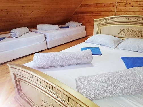 2 этаж: мансарда: 3 односпальные кровати (800х1950), матрац пружинный или двуспальная кровать (1400х2000) и односпальная кровать (800х1950), прикроватные тумбочки.