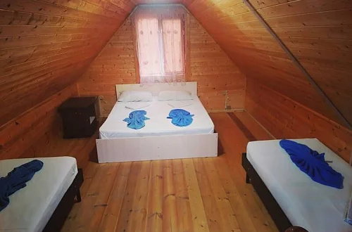 2 этаж: мансарда: 3 односпальные кровати (800х1950), матрац пружинный или двуспальная кровать (1400х2000) и односпальная кровать (800х1950), прикроватные тумбочки, санузел, окно.