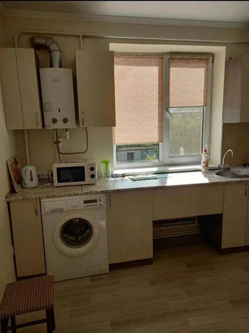 В кухне: холодильник, плита, микроволновка, вытяжка, электрочайник, стиральная машинка, кухонная утварь.