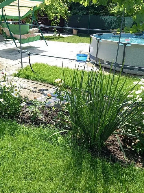 На территории имеется мангальная зона, игровая зона, каркасный сезонный бассейн. Во дворе газонная трава, садовая мебель, садовая качель.