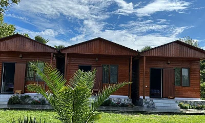 3 семейных домика могут вместить до 5 человек. В каждом домике есть санузел, кондиционер и телевизор с доступом в интернет.