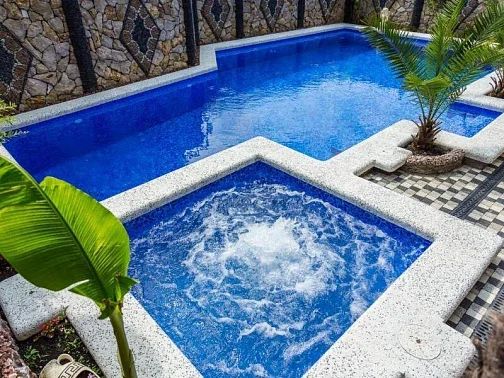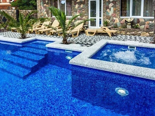 На территории комплекса находится красивый плавательный бассейн с подогревом (ПОДОГРЕВ В МАЕ, ИЮНЕ И СЕНТЯБРЕ!!! В ИЮЛЕ И АВГУСТЕ БАССЕЙН НЕ ПОДОГРЕВАЕТСЯ!).