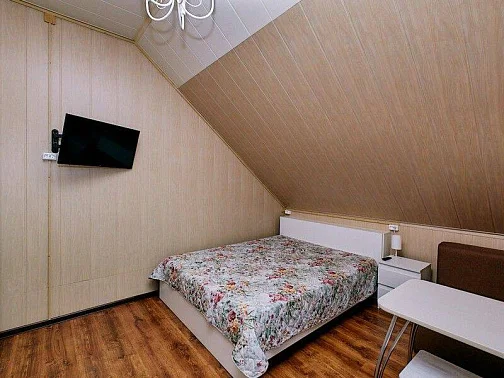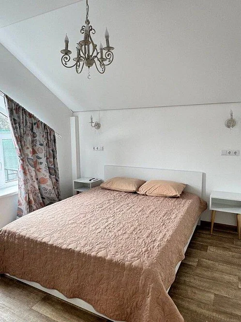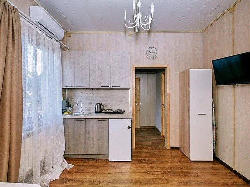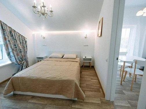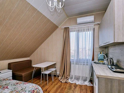 Студия:Уютный номер с двуспальной кроватью и диваном, где самое важное - это ваш комфорт. Здесь есть все для пары или семьи: стильный интерьер, продуманный свет и выход в собственный дворик. Всё сделано для того, чтобы каждое утро ты просыпался с ощущением: "Я выспался!".