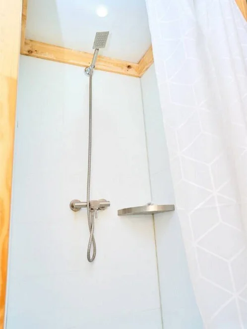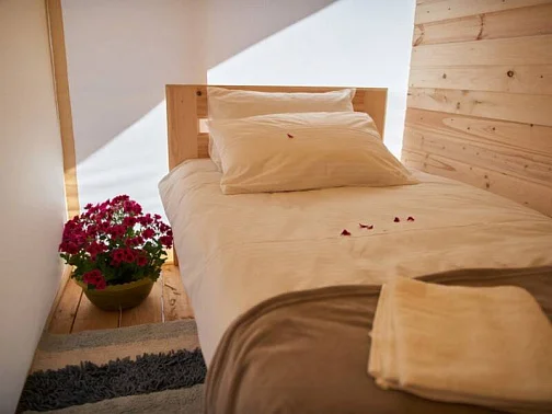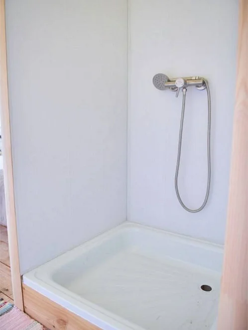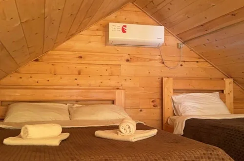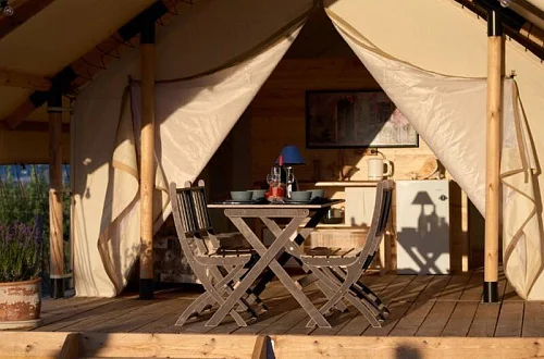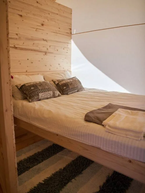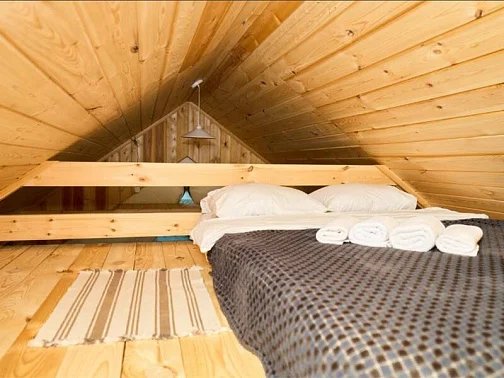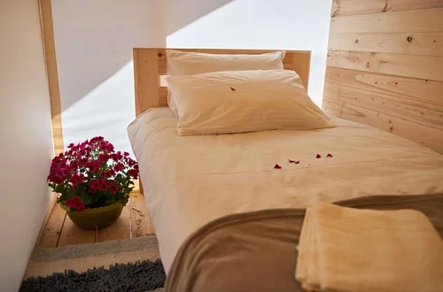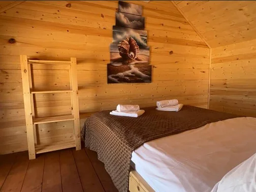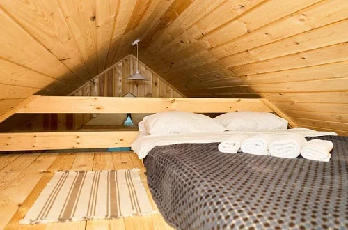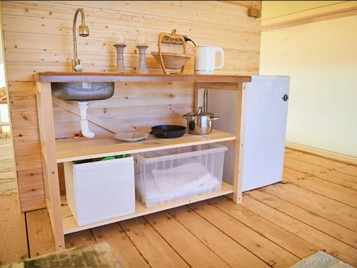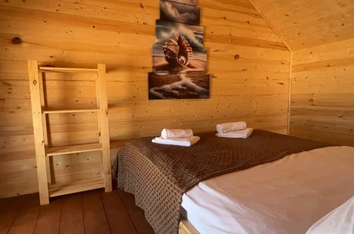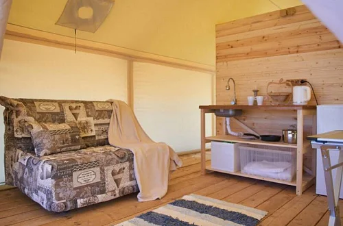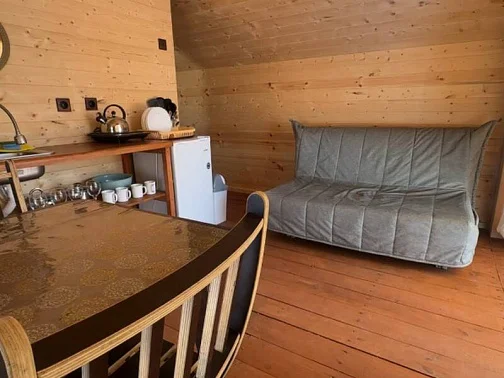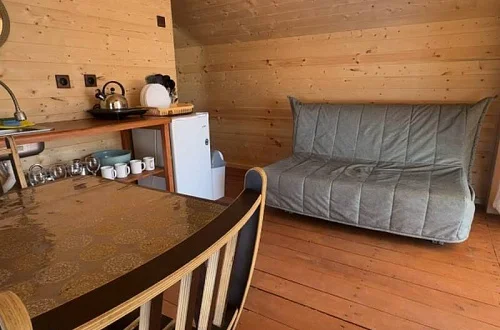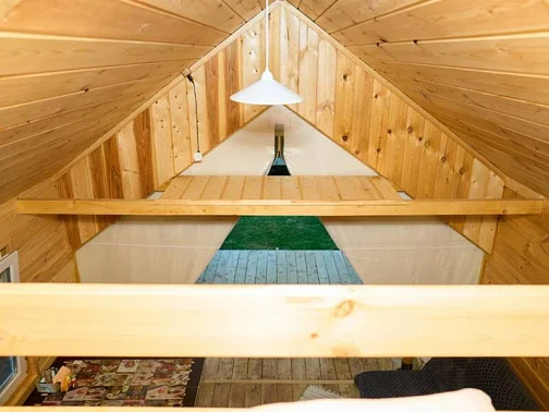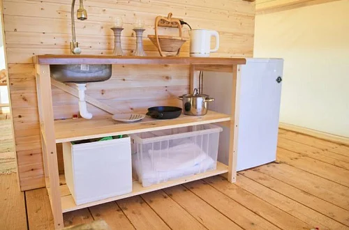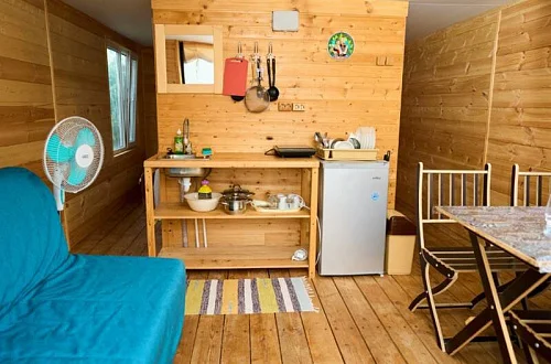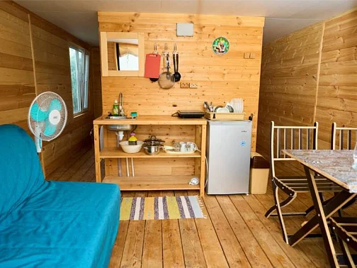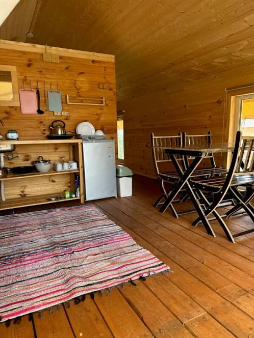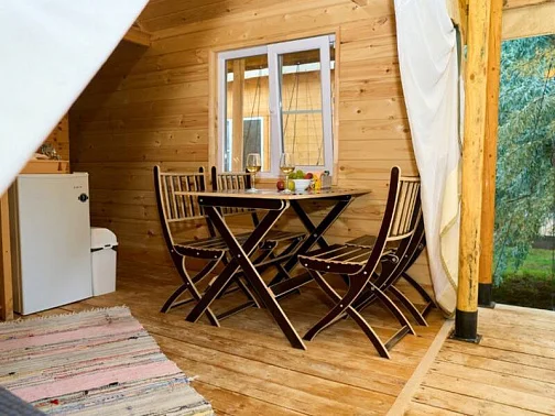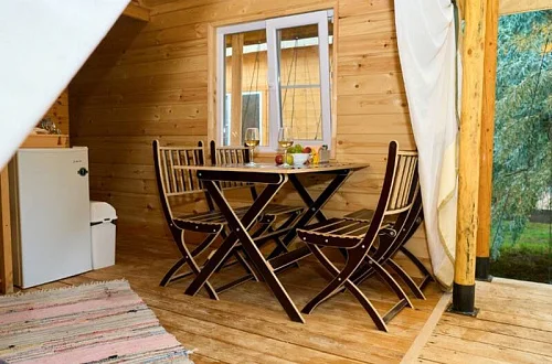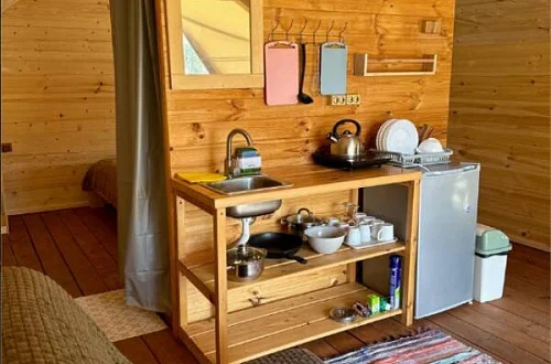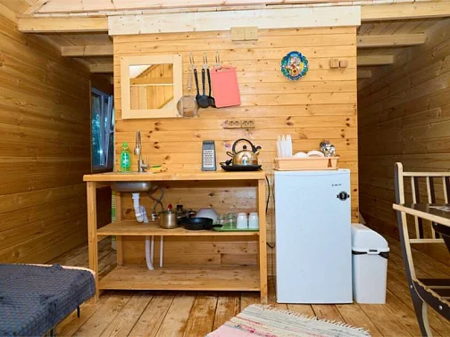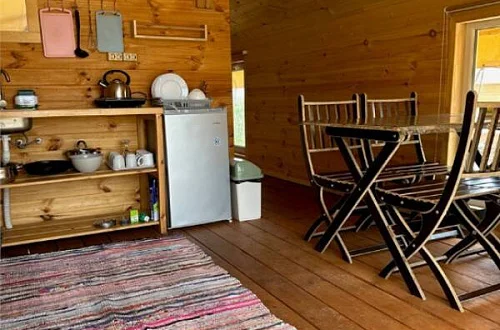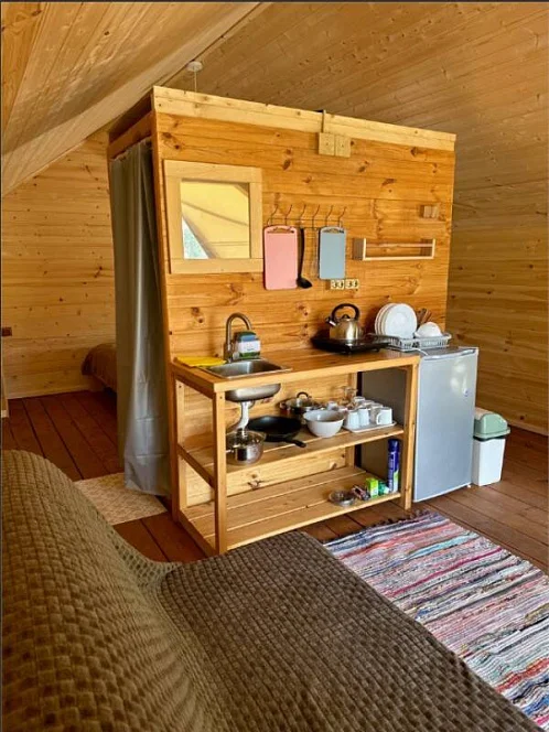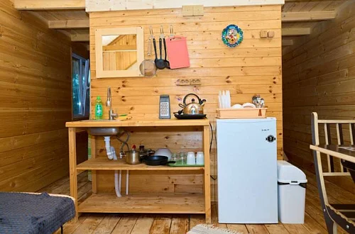 - Уютные домики, оборудованные всем необходимым для городских жителей: от туалета и душа до мини-кухни с холодильником и обеденной зоной.