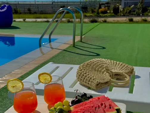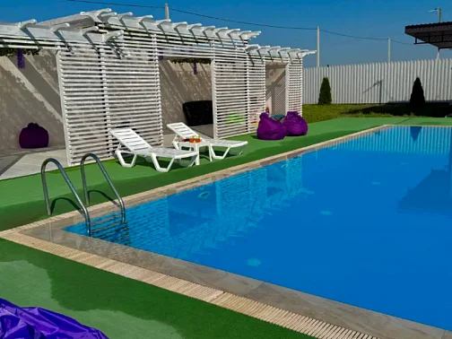 На территории шикарный большой бассейн с шезлонгами для отдыха, мангальная зона со всем необходимым, двор весь в зелени, облагорожен. Для деток есть батут, качели, детская зона, уличная площадка для игр.