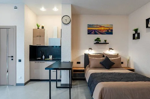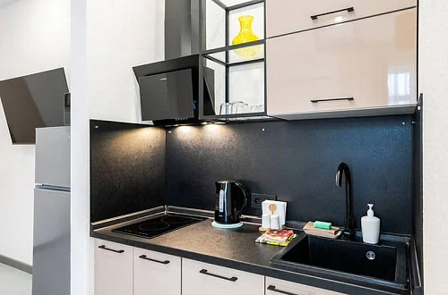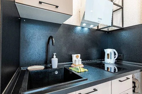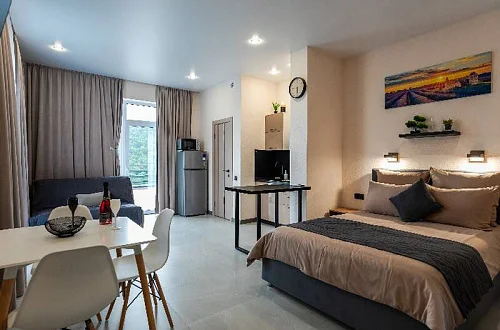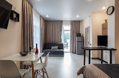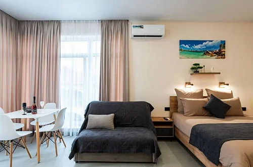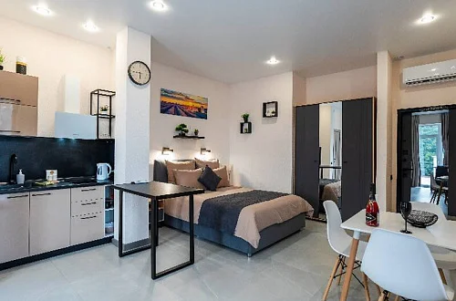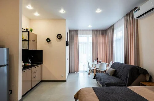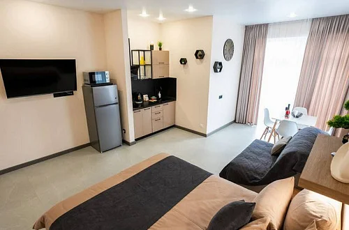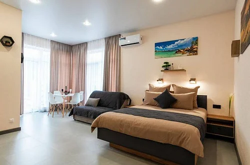 Удобные двуспальные кровати с ортопедическими матрасами "Ascona" и прикроватными тумбочками. Ванная комната оснащена всем необходимым (душем, санузлом, раковиной с зеркалом, феном, туалетными принадлежностями). В номере расположены кухня (варочная панель на 2 конфорки, вытяжка, микроволновка, эл. чайник, холодильник, раковина и полный комплект посуды), кондиционер, Smart-ТВ, Wi-fi. В Номере есть все, что нужно для комфортного проживания. Для проживания более 2 человек имеется диван-кровать.