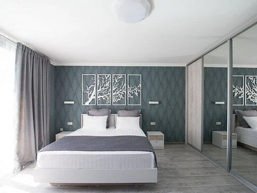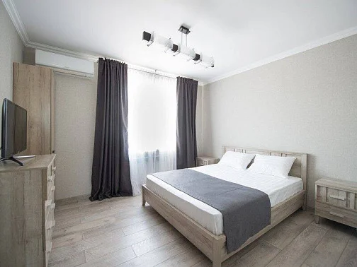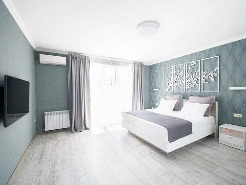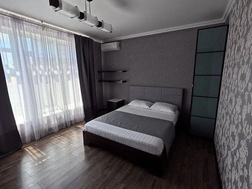 Двуспальная кровать 180 см., прикроватные тумбочки, большой вместительный шкаф-купе, телевизор (спутниковое ТВ), сплит-система.
