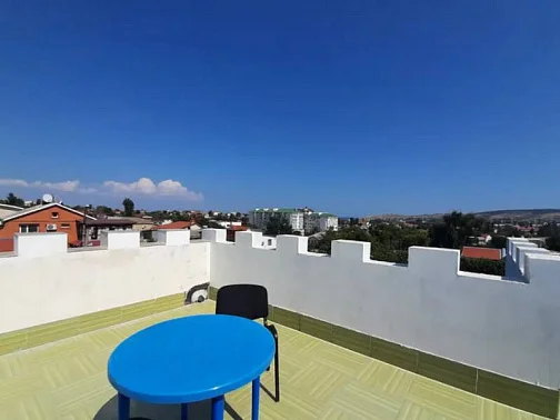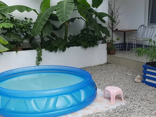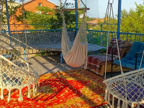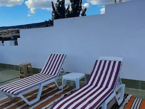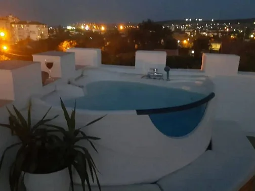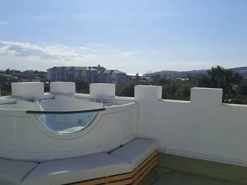 Здесь есть большая кухня, мангальная зона, веранда с качелями, шезлонги и джакузи на открытой крыше, чтобы вы могли насладиться свежим воздухом и солнцем.