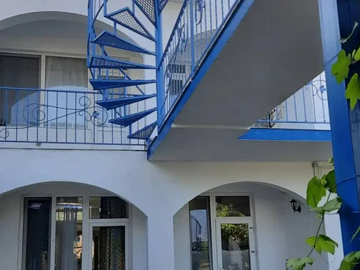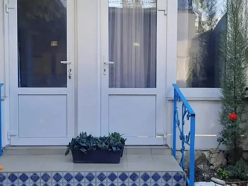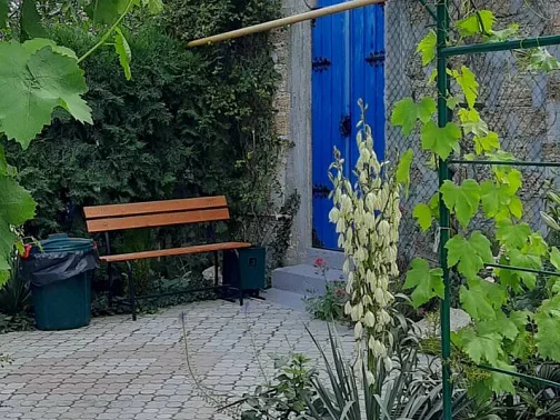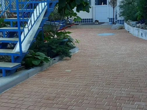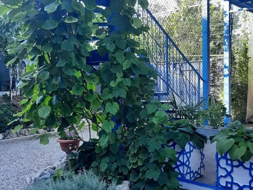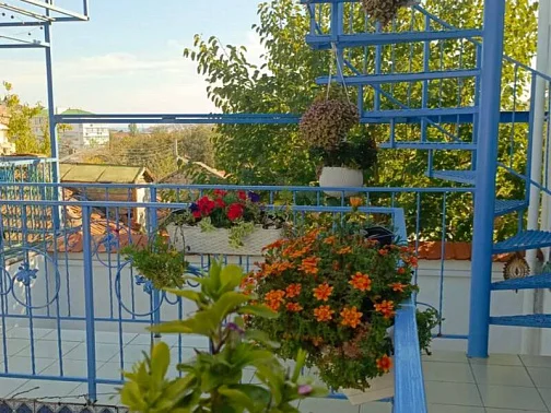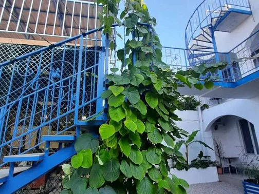 Вас встретит зелёный цветущий двор, где в изобилии растут южные растения: виноград, который можно срывать и есть, создаёт тень, защищая от знойного солнца, канны и гибискусы, юкки и агавы, крымские и банановые пальмы, а также хвойные деревья, создающие атмосферу средиземноморского побережья. Бассейн охладит вас в жаркий день.