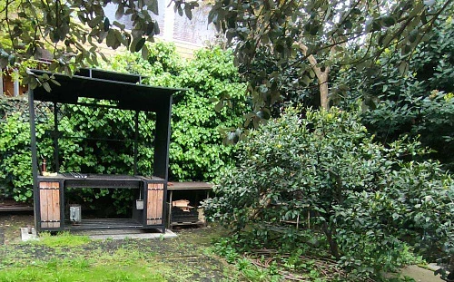 Во дворе возле дома расположен деревянный навес с мебелью.