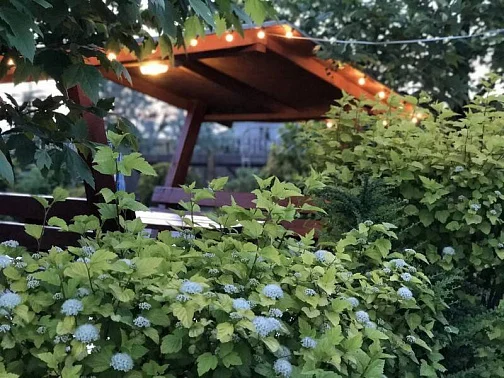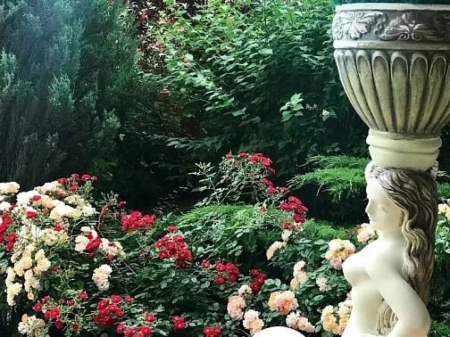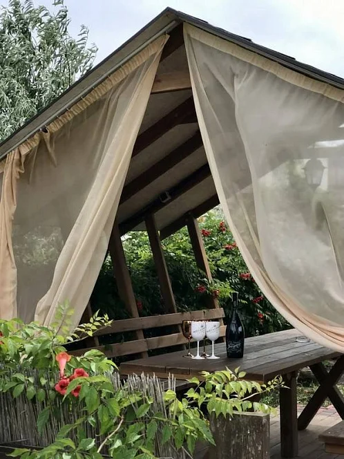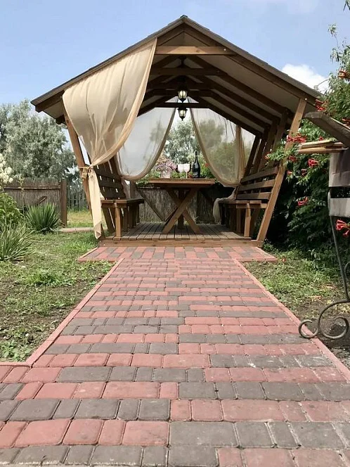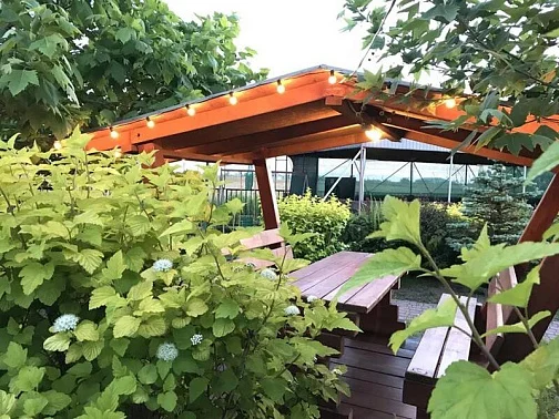 На территории гостевого дома вы можете отдохнуть в уютных беседках, на лавочках среди роз и хвойных деревьев.