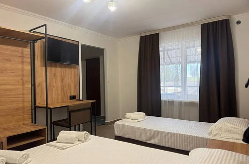 Предоставляется интернет Wi-Fi и осуществляется круглосуточное видеонаблюдение. На территории отеля находится общая кухня, зона отдыха, парковка для личного транспорта, детская площадка. Уборка номеров каждые 3 дня, смена постельного белья каждые 5 дней.