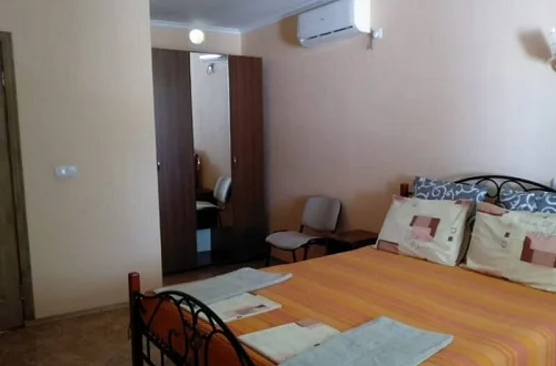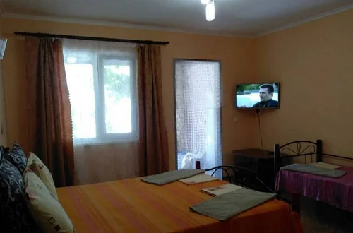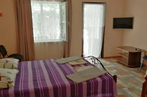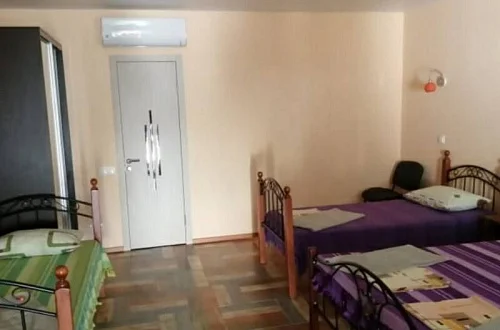 Просторные номера, площадью 20-25 кв.м. рассчитаны на 3-4х человек. В номере вы найдете большой шкаф, куда сможете сложить все свои вещи, различные тумбочки для удобства, а главное комфортные кровати, кондиционер. Мужчин порадует наличие Smart TV, а женщин - зеркало во весь рост. В каждом номере душевая комната, совмещенная с туалетом. Также к каждому номеру прилегает большая терраса с обеденной зоной. Здесь же стоит личный холодильник, электро чайник. Терраса у каждого номера индивидуальная, ограждена от "внешнего мира" зелеными растениями. Рядом с номерами (а у нас их всего три) общая кухня. Здесь Вы найдете всю необходимую посуду. На кухне две рачих поверхности для удобства. Так же на территории есть небольшая детская площадка и мангальная зона. Есть Wi-Fi интернет, стиральная машина.