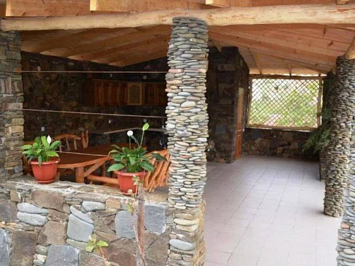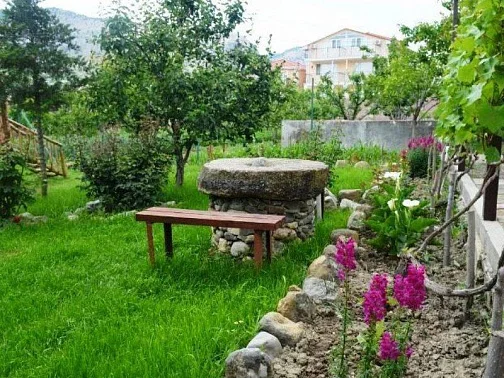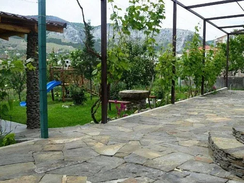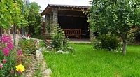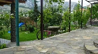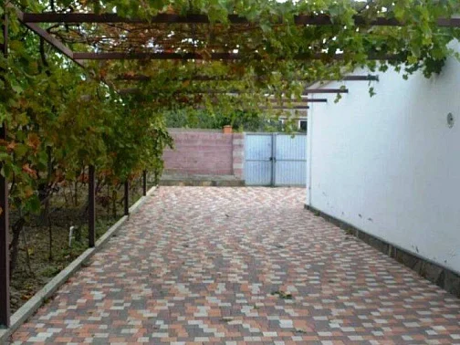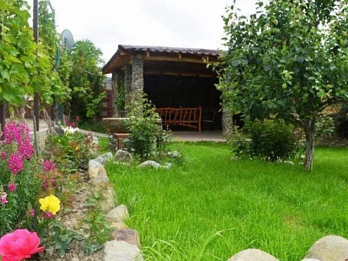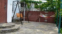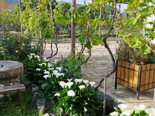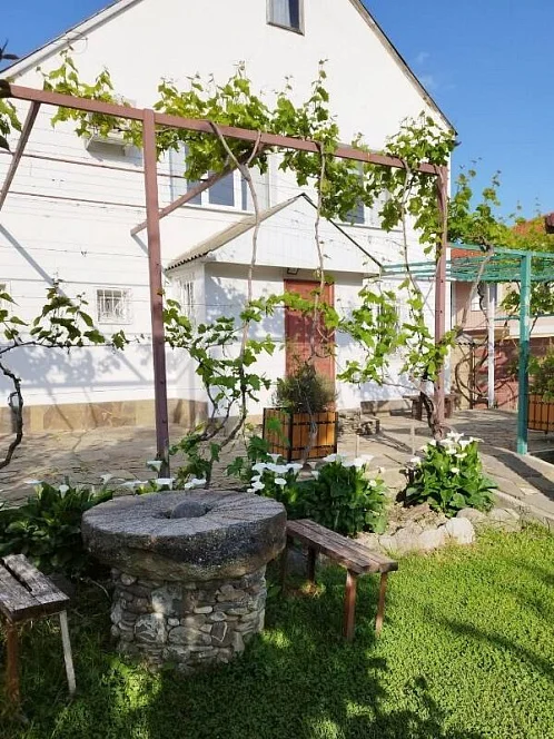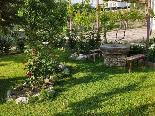 У дома большой сад, газон, цветы, клумбы, качели, гамак. Весь двор весь увит вкусным виноградом. Во дворе просторная оборудованная кухня, принадлежности для барбекю, мангал. Рядом находится