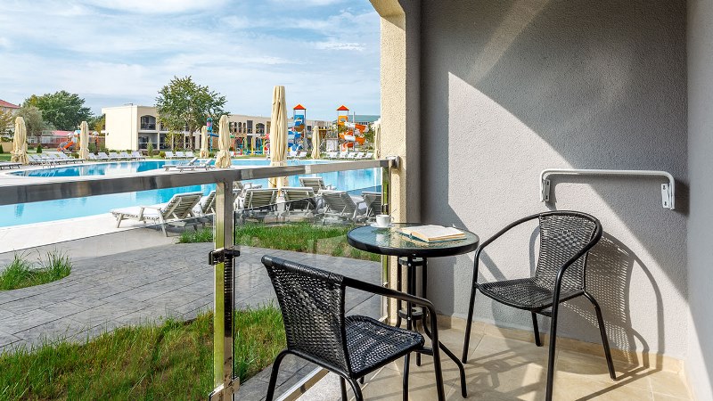 - аква комплекс: Общая площадь водного пространства на территории составляет более 1200 кв.м., разной формы и глубины для всех возрастов, а именно: Плавательный бассейн с подогреваемой водой (25 метровый, глубина 170 см.), детский бассейн с аквагоркой (глубина 60 см.), Spray Park, бассейн с тремя горками, высотой от 3,5 до 5-ти метров и слайдом, Lounge бассейн с пологим дном от 90 см. до 140 см. и подогревом, шезлонги, навесы;
