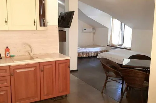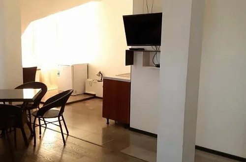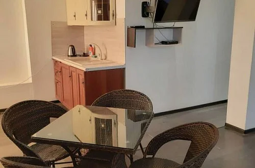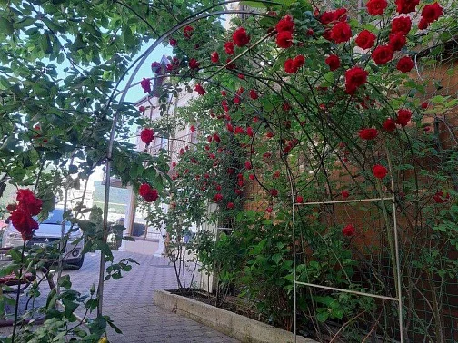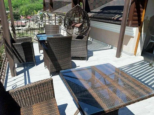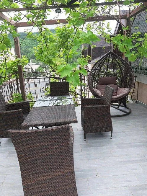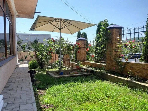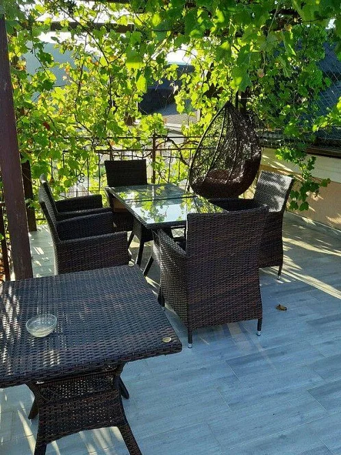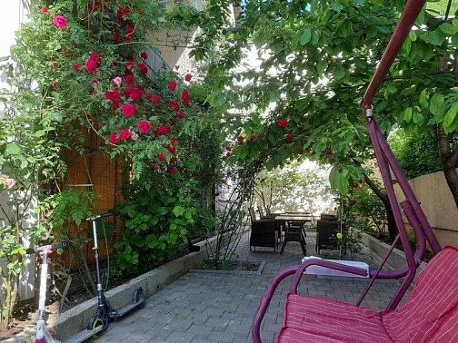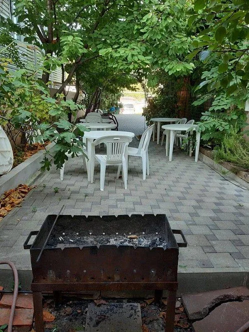 Приятный дворик, имеется терраса, барбекю, мангал, детская площадка, парковка для автомобилей, беседка, декоративные растения. Также хол гостевого дома оборудован удобствами и в общей кухни предоставляется техника для самостоятельного приготовления.