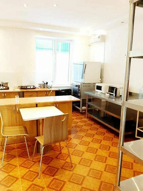 Общая кухня: газовая плита, микроволновая печь для приготовления пищи, эл. чайник, посуда, столовые приборы, обеденный столы, стулья.