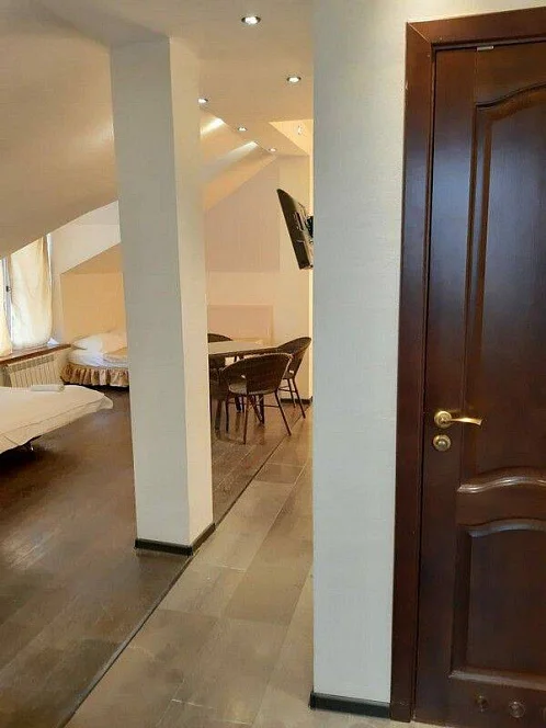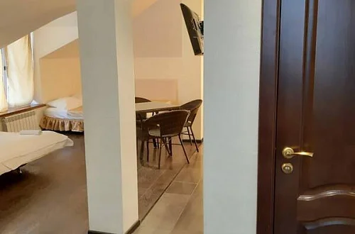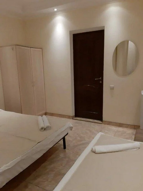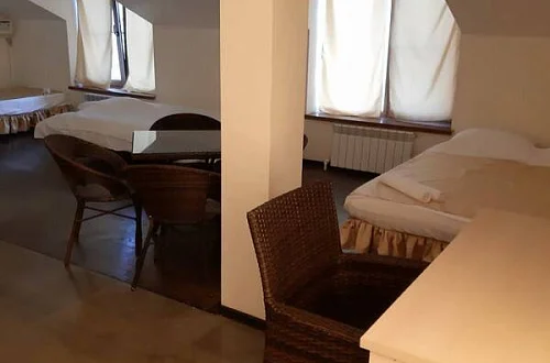 - 1 этаж - холл (телевизор, диван, столы и стулья, теннисный стол), кухня для самостоятельного приготовления пищи со всем необходимым кухонным инвентарем (посуда, сковородки, кастрюли, микроволновка, газ. плиты, столы и стулья), 3 номера, умывальник, туалет.