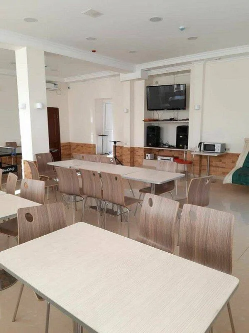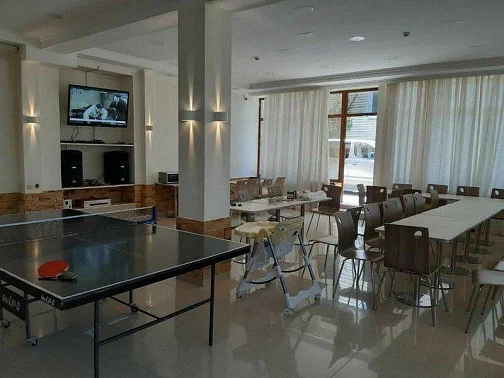 Внутренний интерьер холла: обеденные столы, стулья, мягкий диван для гостей, общий телевизор, DVD-проигрыватель, три колор, настольный теннис.