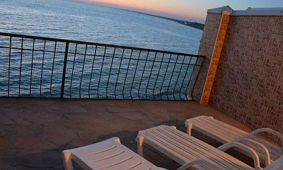 В доме имеются все удобства, автономное отопление, спутниковое ТВ, домашний кинотеатр", Wi-Fi, горячая/холодная, вода (автономно), газ, стиральная машина, микроволновая печь, холодильники, охраняемая закрытая территория, гараж + парковка, мангальная - зона барбекю (сразу напротив входа в дом). В доме 3 этажа (кухня- вся посуда и принадлежности), холл-столовая (большой обеденный стол), 2 сан узла (на 1 и 2 этажах), 5 комнат 2х-4х-местные, открытая мансарда с видом на море (шезлонги). Беседка у моря (будни дни).