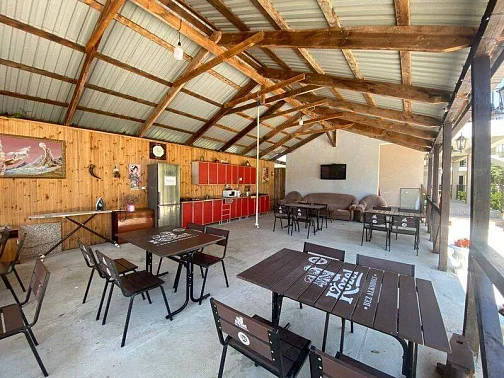 Для самостоятельного приготовления еды оборудована просторная летняя кухня со всей необходимой посудой и бытовой техникой. Для тех, кто стоять у плиты во время отдыха не хочет, можно питаться в столовой, которая находится у дома.
