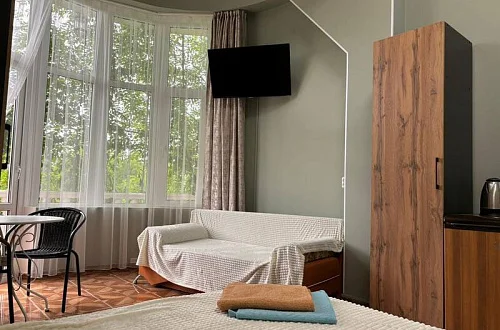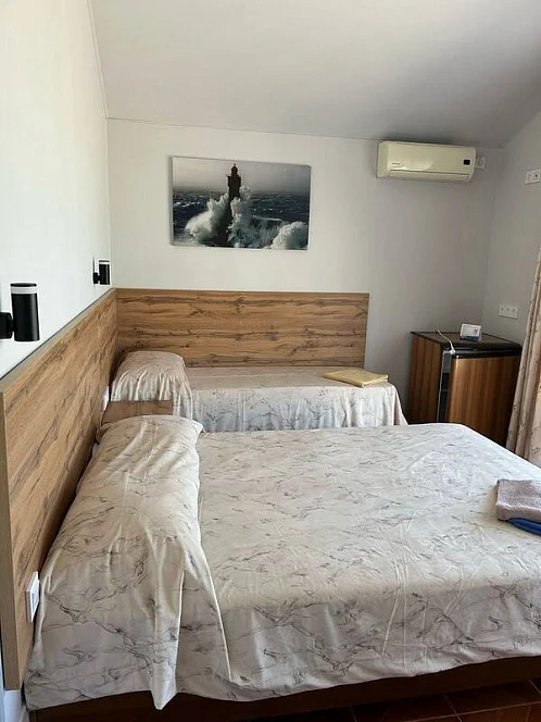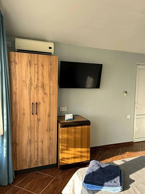 В номерах: мебель (кровати, кресло-кровать, шкафы, тумбочки, стулья), телевизор, холодильник, кондиционер, санузел.