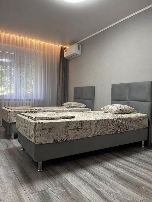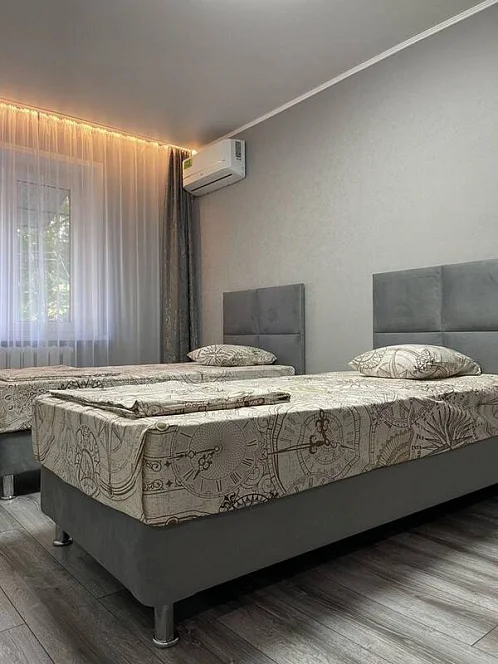 2 кровати одинарные в малой комнате. Двуспальный диван в большой комнате. Ванна и туалет совместные.