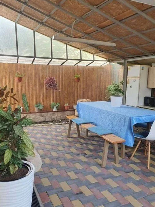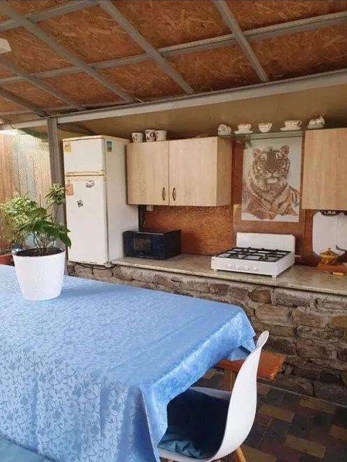 Летняя кухня полностью укомплектована хорошей посудой. Микроволновка, холодильник, газ плита, эл. чайник.