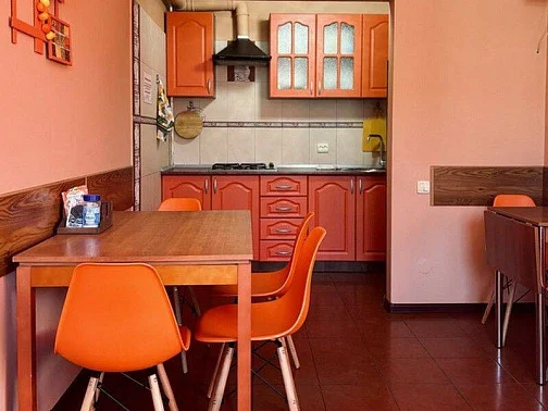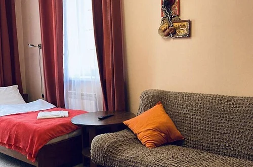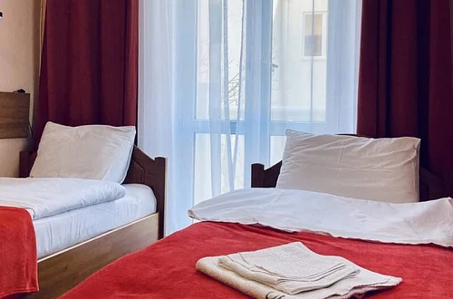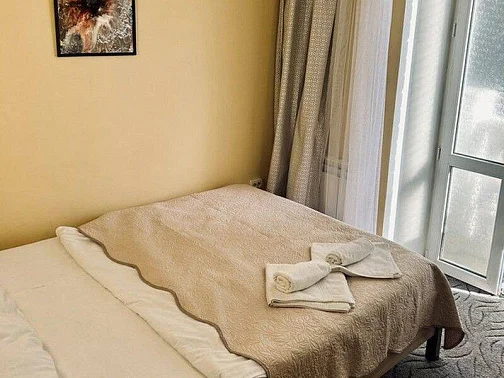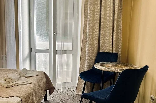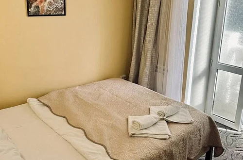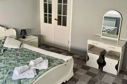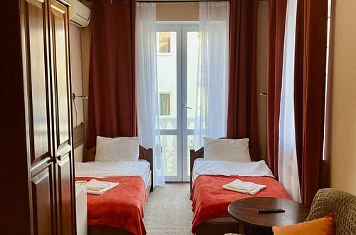 Номера нашего гостевого дома оборудованы всей необходимой мебелью и бытовой техникой, в том числе: большой двуспальной кроватью (160 см), раскладным двуспальным диваном (150 см), телевизором, холодильником, кондиционером, Wi-Fi. Совмещённый санузел находится в каждом номере. Кухни расположены на каждом этаже гостевого дома - на этаже 5 комнат. Имеются номера с выходом на балкон и без балкона, также на каждом этаже есть общий большой балкон с красивым видом на горы.
