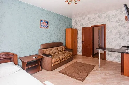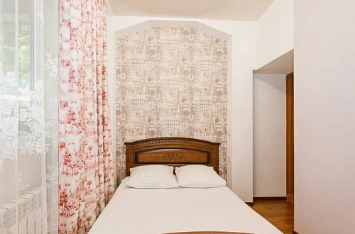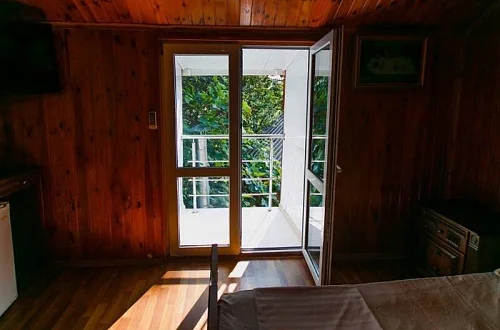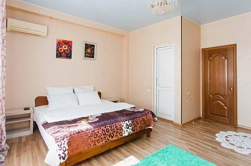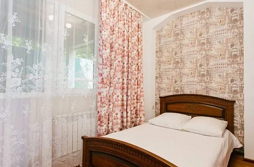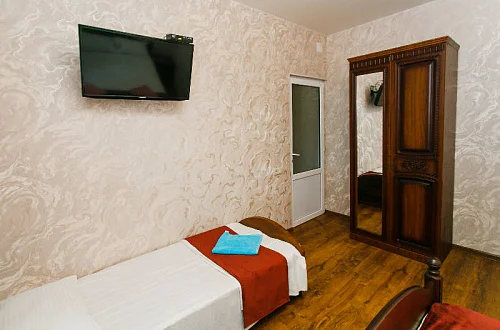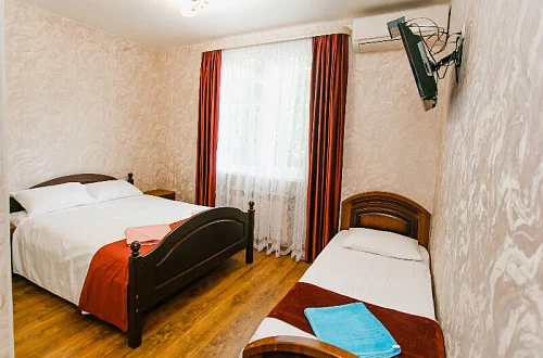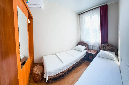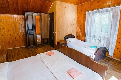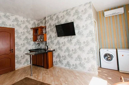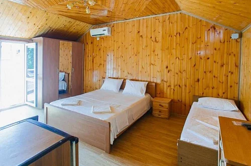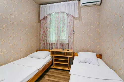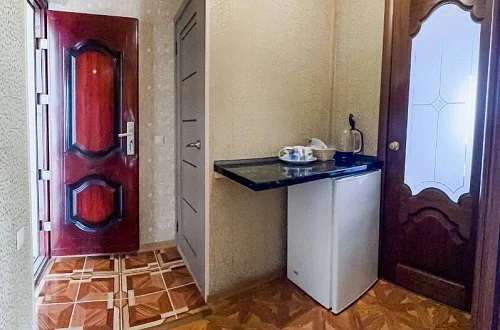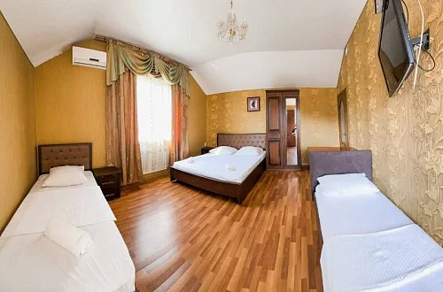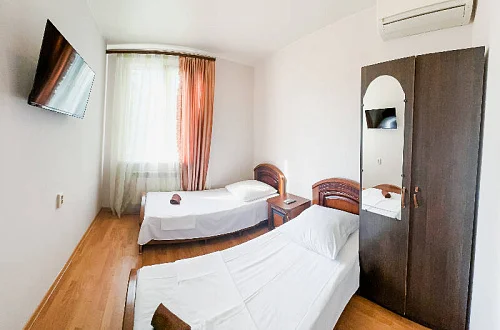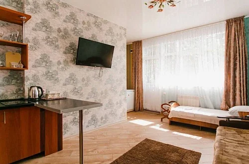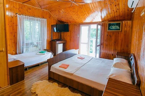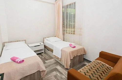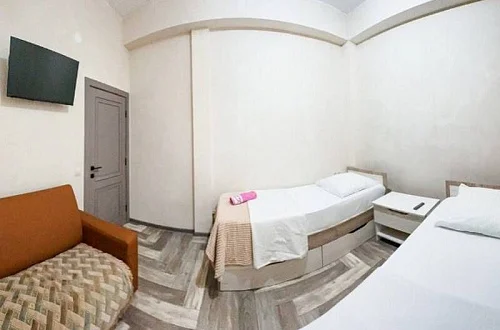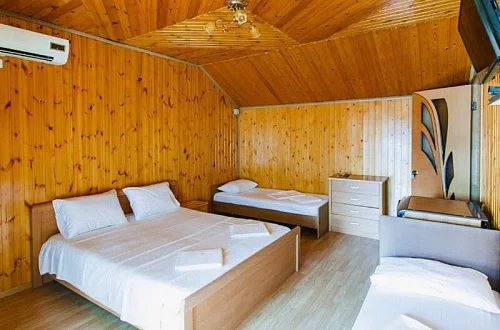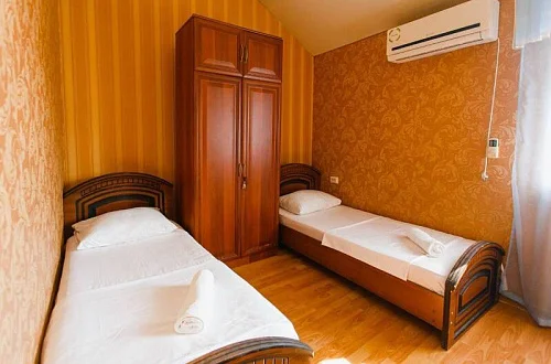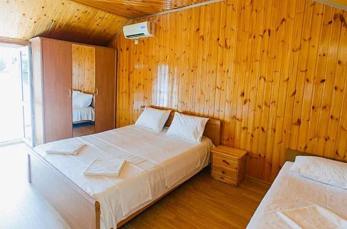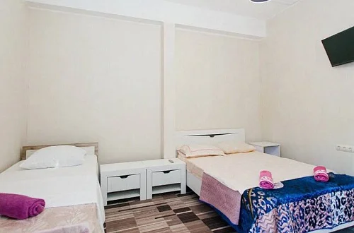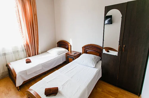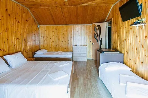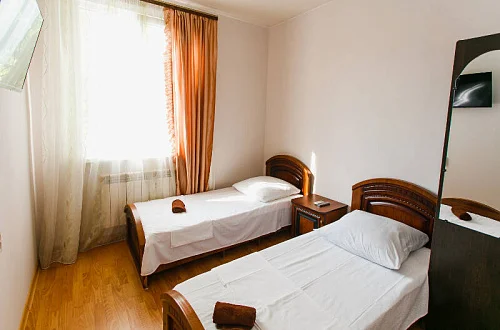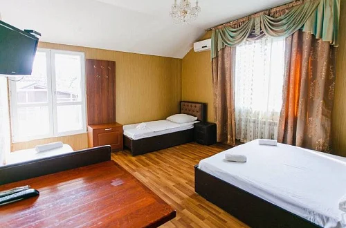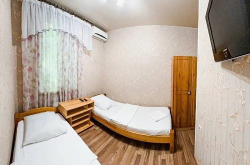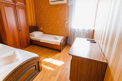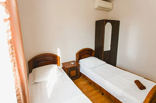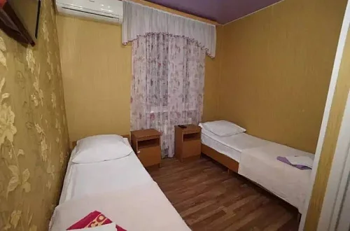 Расположен в уютном месте, для гостей приготовлены комфортные одно и двух комнатные номера со своими и общими кухнями, которые оснащены всем необходимым. Все номера оборудованы холодильниками, телевизорами, кондиционерами.