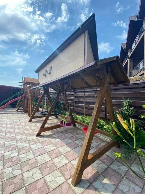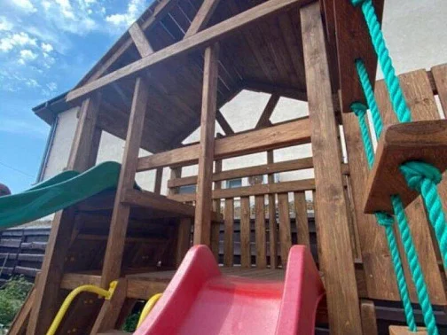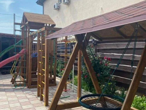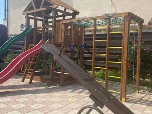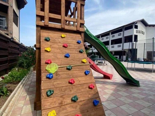 Родители могут отдыхать в шезлонгах после вкусного обеда, ужина и наблюдать за детками, которые будут играть на детской площадке: прыгать на батутах, лазить по деревянному городку, кататься с горки, качаться на качелях-балансирах и качелях, рассчитанных на любой возраст, и просто веселиться в кругу сверстников.