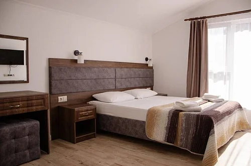 В номерах есть все необходимое для удобства гостей, на территории отеля есть кафе-столовая, бар и бассейн.