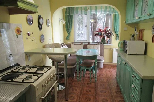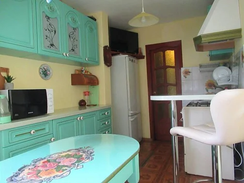Уютная кухня (кухонный гарнитур, стол, 2 стула, диванчик, холодильник, телевизор, газовая плита с духовкой, микроволновка, электрочайник);