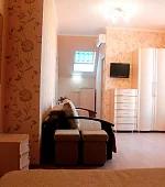 Размещение: для проживания предлагаются номера с удобствами и несколько комнат эконом класса, расположенных на втором этаже с общим раздельным санузлом. В комнатах находятся телевизоры и вентиляторы, на первом этаже маленькая оборудованная кухня. Для отдыха есть уютная летняя беседка. Инфраструктура: 50 метров отделяют дом от аквапарка, дельфинария, океанариума. Рядом несколько столовых, магазины, сувенирные палатки, гипермаркет "Магнит".