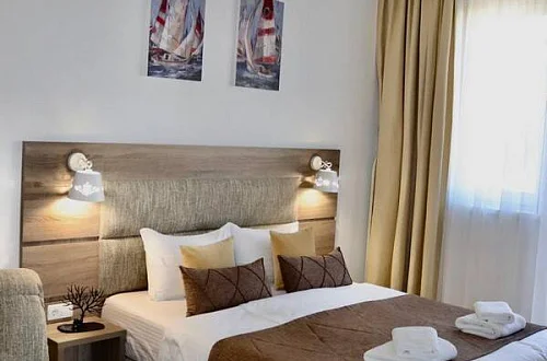 • 2х-местный с двуспальной кровать с ортопедическим матрасом "Комфорт", в комнате, для комфортного проживания: личный санузел с душем, кондиционер, рециркулятор, для снижения риска заражения COVID-19, москитные сетки, смарт ТВ, Wi-Fi, фен, сейф.