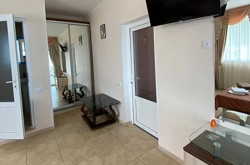 На первом этаже находится застекленная терраса и общий балкон на два номера (1 и 2 номера) с видом на море. На балконе для каждого номера есть комплект плетёной