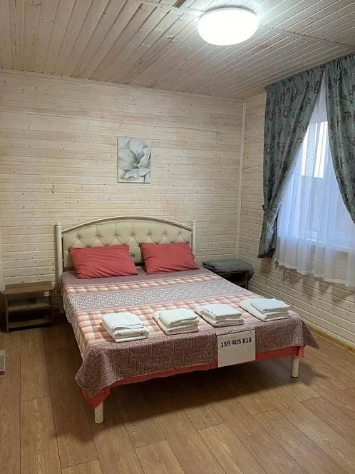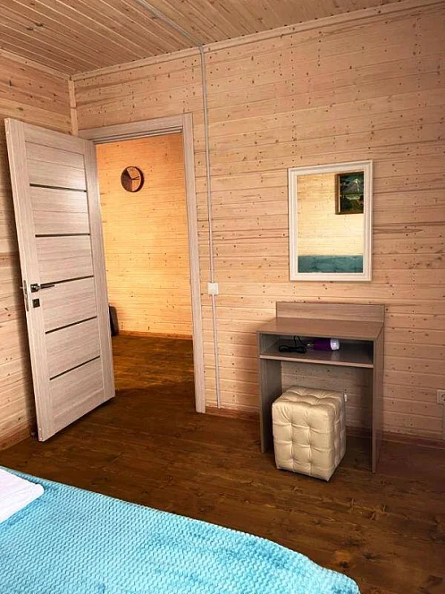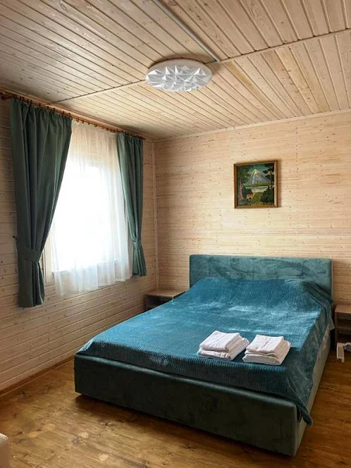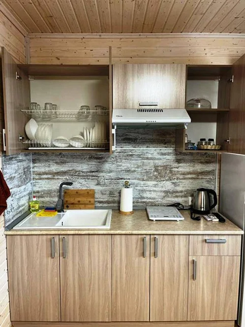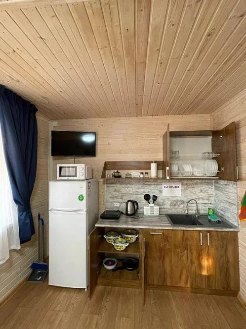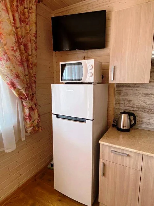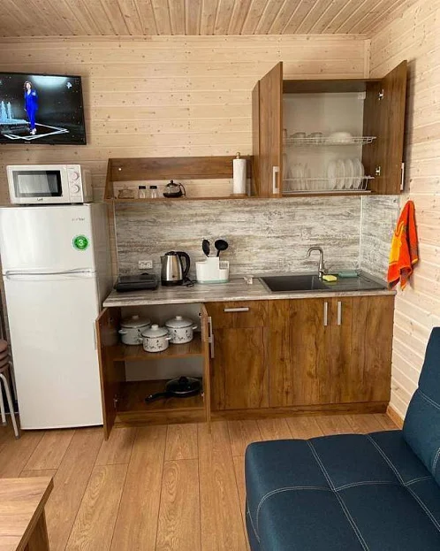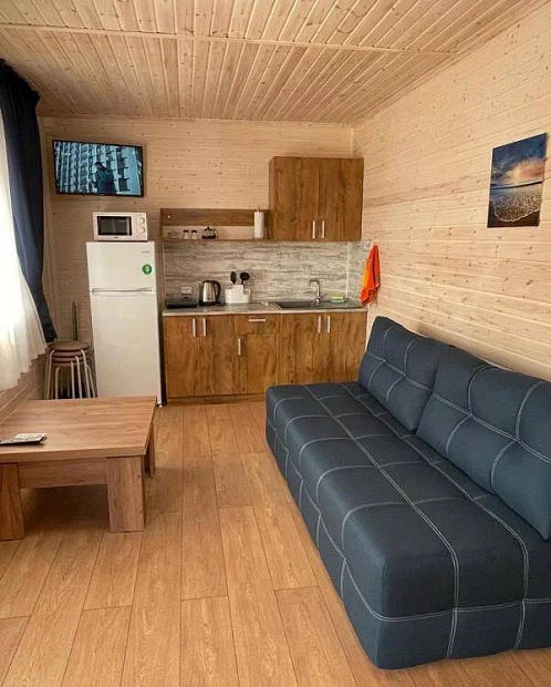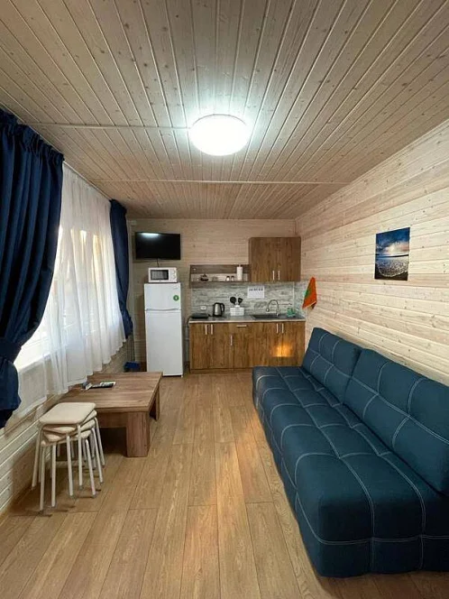 Рассчитан домик на проживание 4-х человек (поселение пятого человека осуществляется за дополнительную плату). Домики состоят из двух комнат : первая- кухня-гостиная, в которой стоят кухонная мебель с полным набором посуды для приготовления и приема пищи, микроволновая и индукционная печи, холодильник, телевизор, раздвижной диван, журнальный столик-трансформер, шкаф для одежды и вторая комната- спальня, в которой расположены двуспальная кровать с набором постельного белья, прикроватные тумбочки, туалетный столик. Домики оснащены сплит-системами.