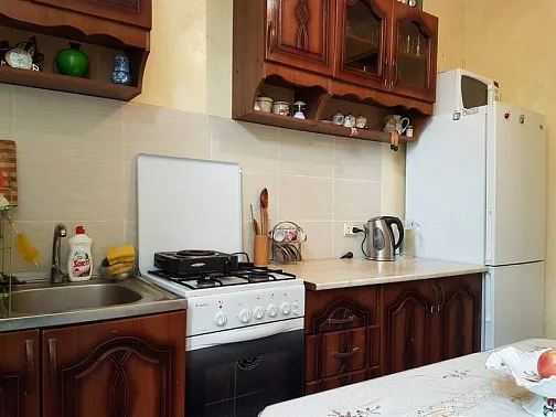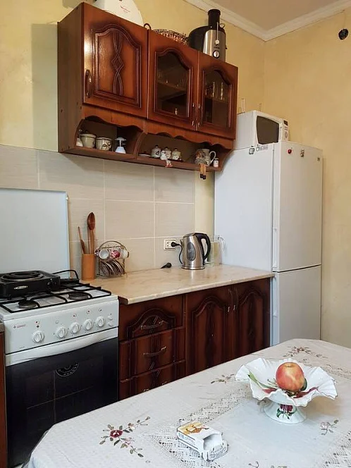 Современная кухня полностью укомплектована газовой и электроплитой, холодильником, микроволновой печью, а также полным набором кухонной утвари и столовых приборов.